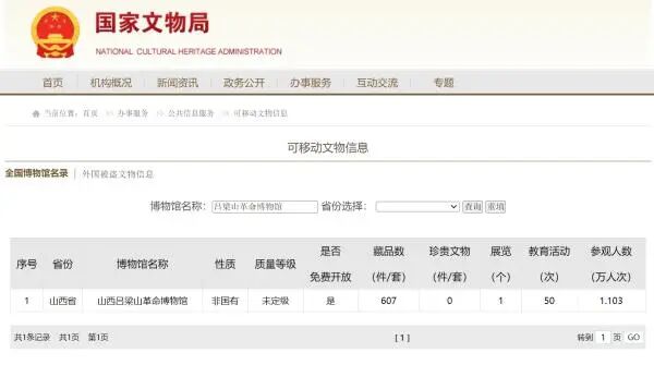 国家文物局官网公示的可移动文物信息显示,山西吕梁山革命博物馆性质为非国有,质量等级未定级,藏品数为607件/套,0件/套珍贵文物。