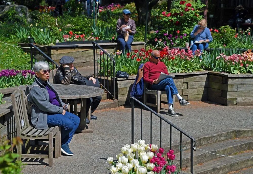 4月20日,在美国纽约的一处花园,人们在盛开的郁金香附近休憩。新华社记者 李睿 摄