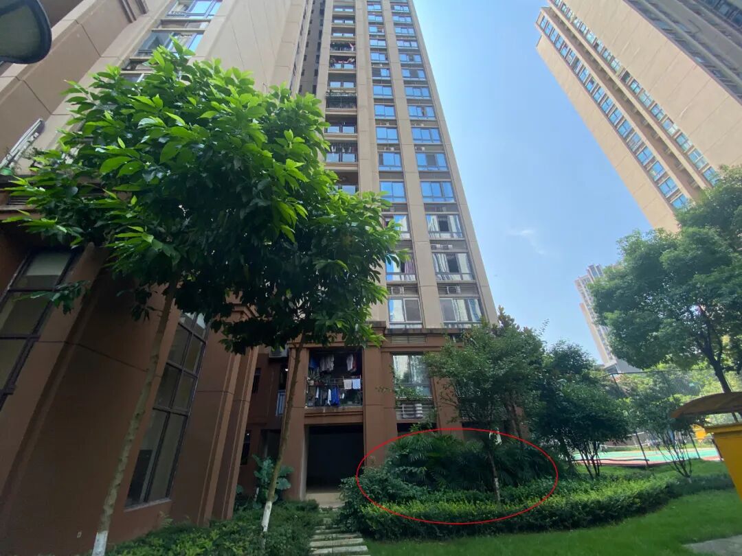 2020年11月2日,2名幼童从重庆南岸区锦江华府4栋15楼坠下(红圈处)。图片来源:澎湃新闻,记者 谢寅宗
