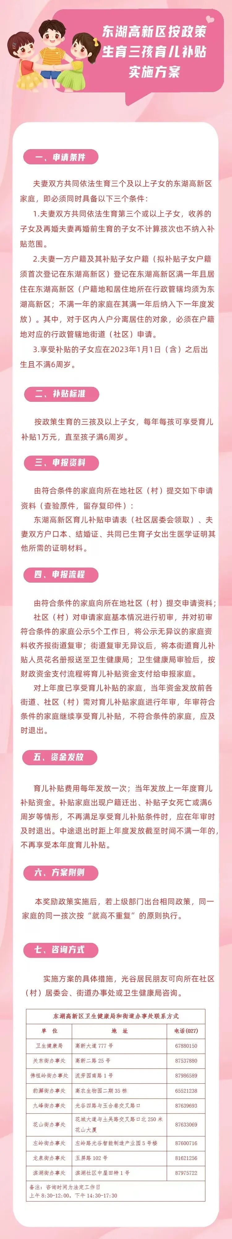 三孩最高补6万元!武汉一地发布 2023-05-12 16:23 极目新闻 0 在第112个“5·12”国际护士节之际,东湖高新区发布《按政策生育三孩发放育儿补贴实施方案》,对2023年1月1日后满足相关条件生育三孩及以上子女的家庭,每年每孩可享受育儿补贴1万元,最长可享受至6周岁。