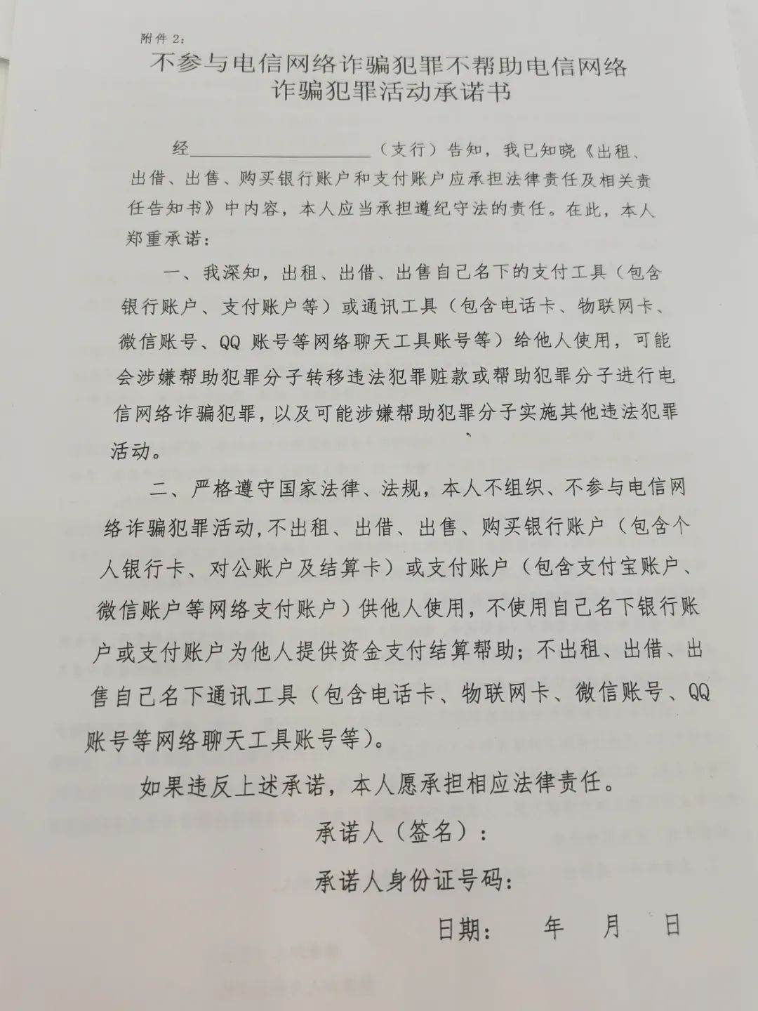 记者发现,多数用户在工作人员的引导下,使用身份证、银行卡、开户预留电话号码办理解冻业务,并现场签署《出租、出借、出售、购买银行账户或支付账户应承担法律责任及相关责任告知书》《不参与电信网络诈骗犯罪不帮助电信网络诈骗犯罪活动承诺书》等文件。