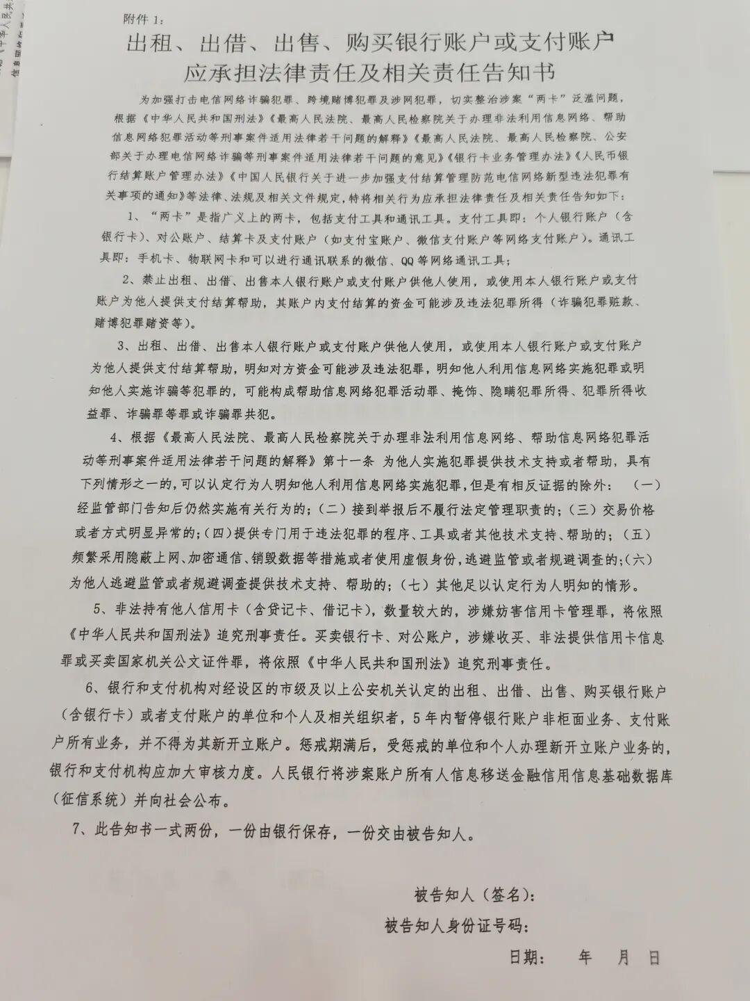 《出租、出借、出售、购买银行账户或支付账户应承担法律责任及相关责任告知书》(央广网记者 王开妍 摄)
