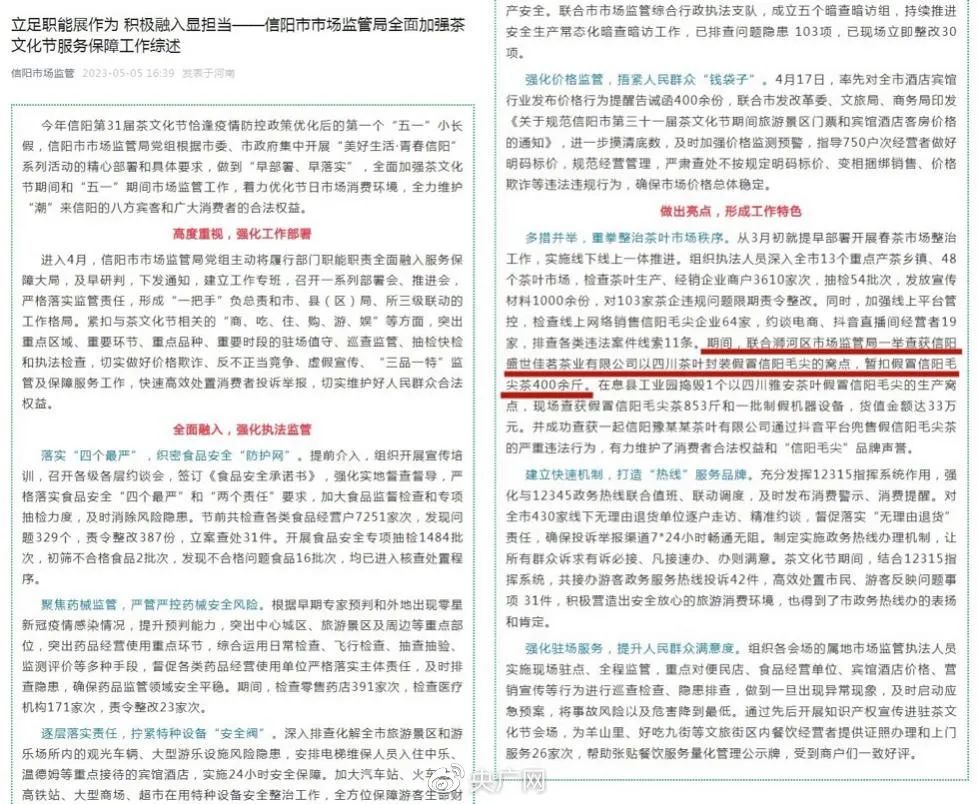 信阳市市场监管局宣传科工作人员表示,该文是信阳第31届茶文化节结束之后,该局上报的服务保障茶文化节的工作总结。该工作人员表示,文中所说的“查获茶叶400斤”数字有误,因工作人员为了抢时间效应,尽快发稿,敲错键盘,没有认真地校稿导致数据错误。目前案件正在调查,还未结案,而稿子发在该案结案之前,属于工作失误。