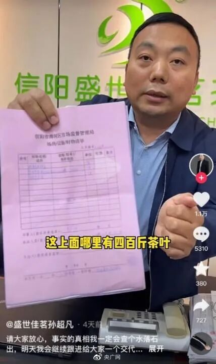 针对文章中提到的问题,盛世佳茗通过社交平台发布澄清视频,否认以川茶冒充信阳毛尖销售。企业负责人孙超凡在网络上称,4月12日,信阳市市场监管局和浉河区市场监管局来到企业后,取走了产品和包装等3样东西,取走的茶叶连4斤都不到,并出示了市场监管部门暂扣物品手续。