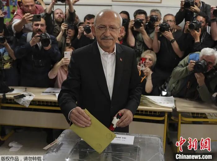 当地时间5月14日,土耳其总统和议会选举投票开始,图为土耳其反对党总统候选人凯末尔·克勒奇达尔奥卢在投票站投票。当地时间14日,土耳其总统和议会选举开始投票,主要的竞争将在土耳其现任总统埃尔多安,和土耳其最大反对党共和人民党领袖、同时也是由6个反对党组成的“民族联盟”阵营候选人凯末尔•克勒奇达尔奥卢之间展开。据法新社14日报道,两人目前均已在投票站投票。埃尔多安在投票后表示,希望“(大选)结果对我们国家的未来、对土耳其的民主都有好处”。克勒奇达尔奥卢则称,“我们都错过了民主”,并向记者表示“春天会来到这个国家”。