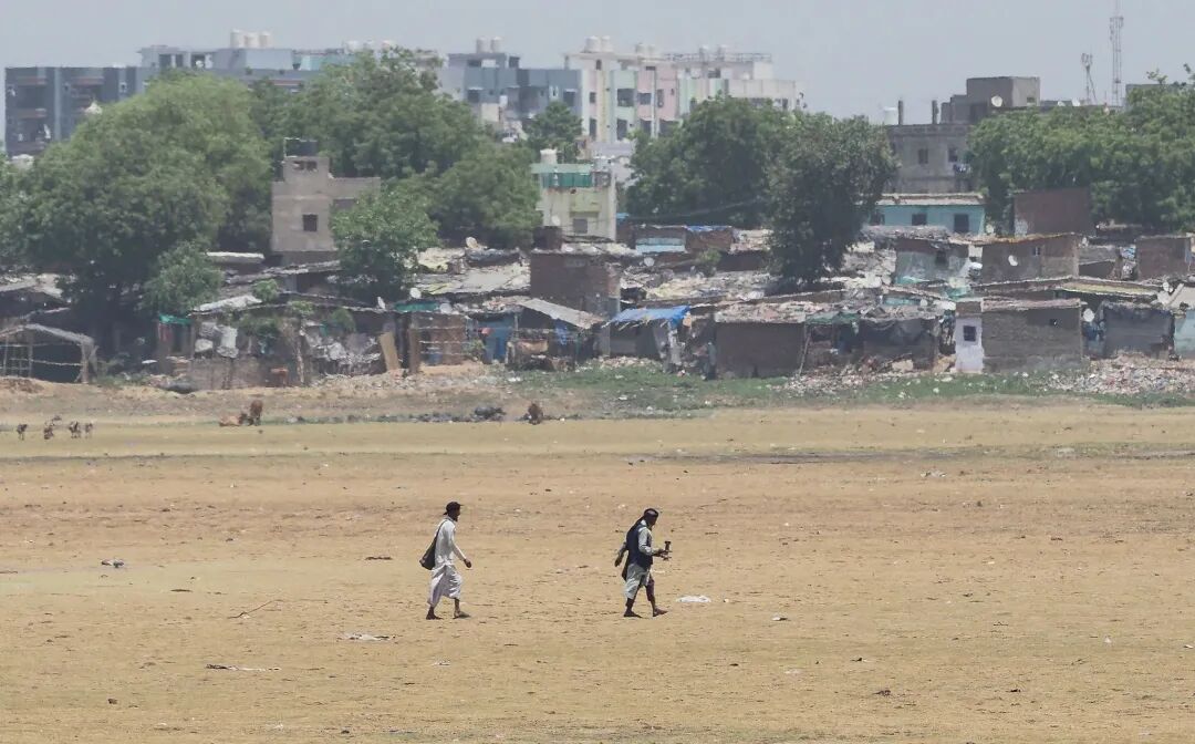 当地时间2023年5月10日,印度艾哈迈达巴德,人们走在干涸的河床上。