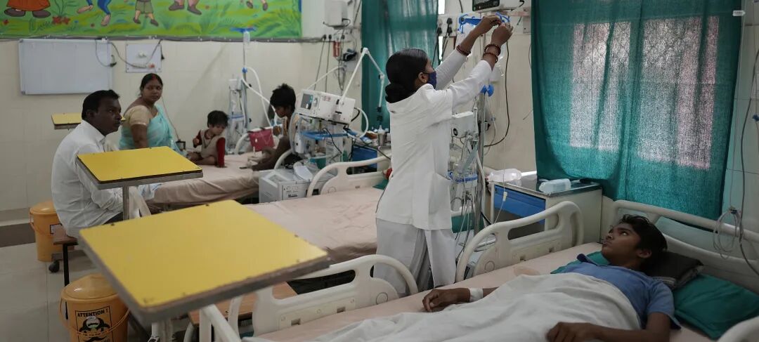 当地时间2022年4月24日,印度普拉亚格拉杰,高温持续,很多孩子因中暑在医院治疗。