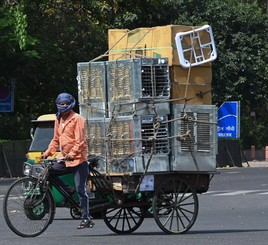 当地时间2023年4月16日,印度新德里,气温飙升至40℃以上,工人运送冷气机。