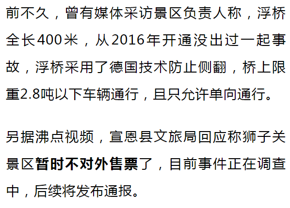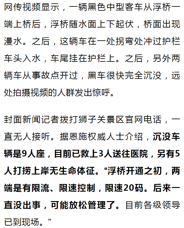 湖北一知名景点突发事故!已致5人身亡 2023-05-16 22:13 封面新闻、沸点视频 0 5月16日,湖北恩施狮子关景区网红浮桥公路出现坠车事故,一辆游览车从浮桥冲出栏杆后沉没。权威人士介绍,车辆是9人座,救上3人送医,另有5人打捞上岸后无生命体征。