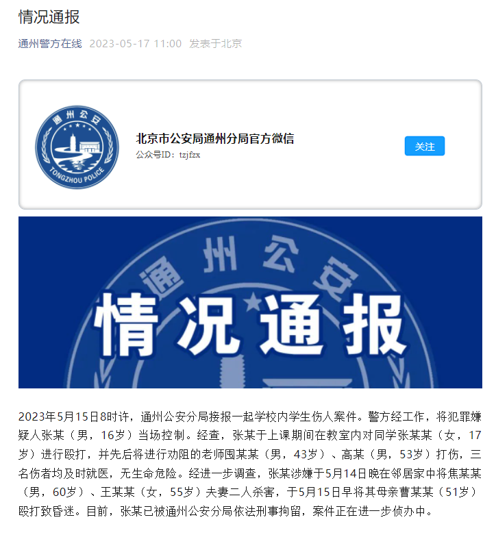 2023年5月15日8时许,通州公安分局接报一起学校内学生伤人案件。警方经工作,将犯罪嫌疑人张某(男,16岁)当场控制。