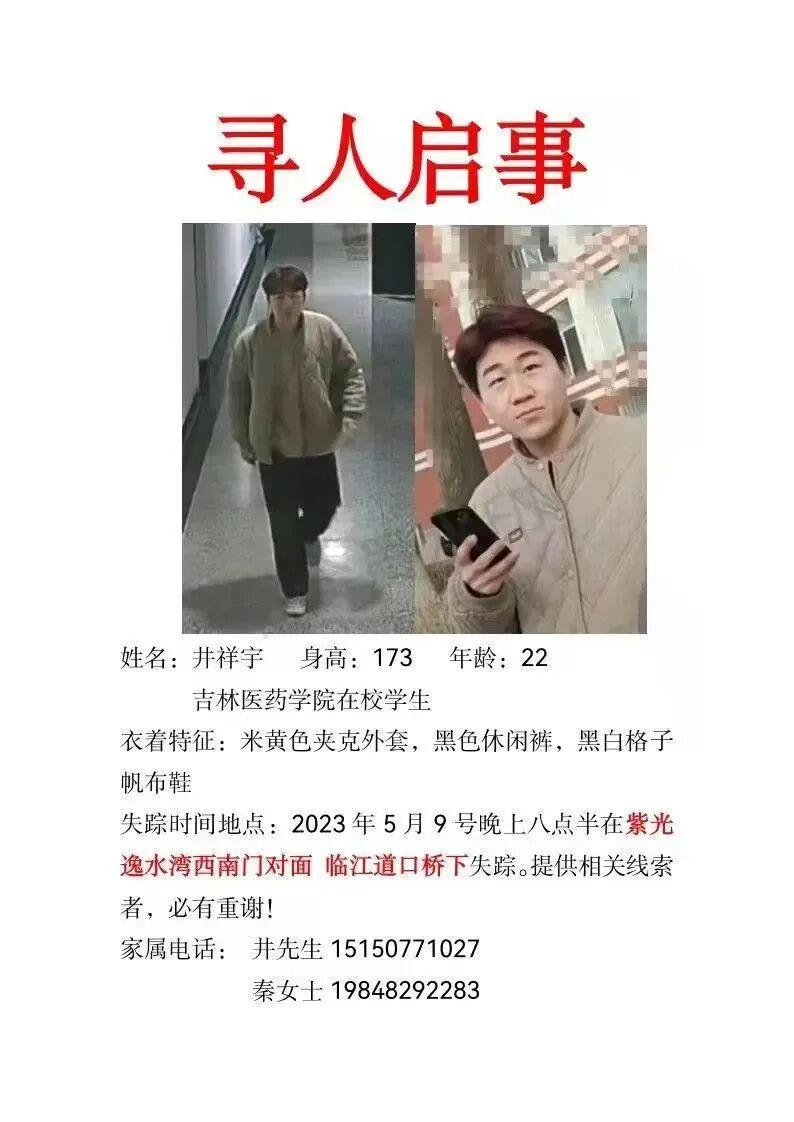 近日,一则吉林医药学院学生失联的寻人启事引发网友关注。寻人启事显示,该名失联男生名为井祥宇,身高175厘米,22岁,为吉林医药学院在读学生,失联时身上穿着米黄色夹克外套,黑色休闲裤,黑白格子帆布鞋。于2023年5月9日晚上8点半在紫光逸水湾西南门对面临江道口桥下失踪。