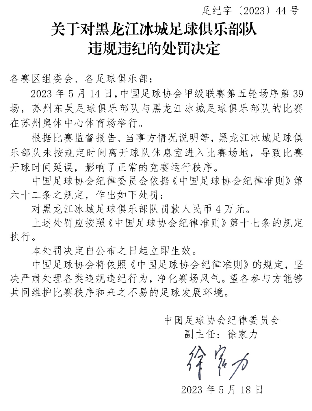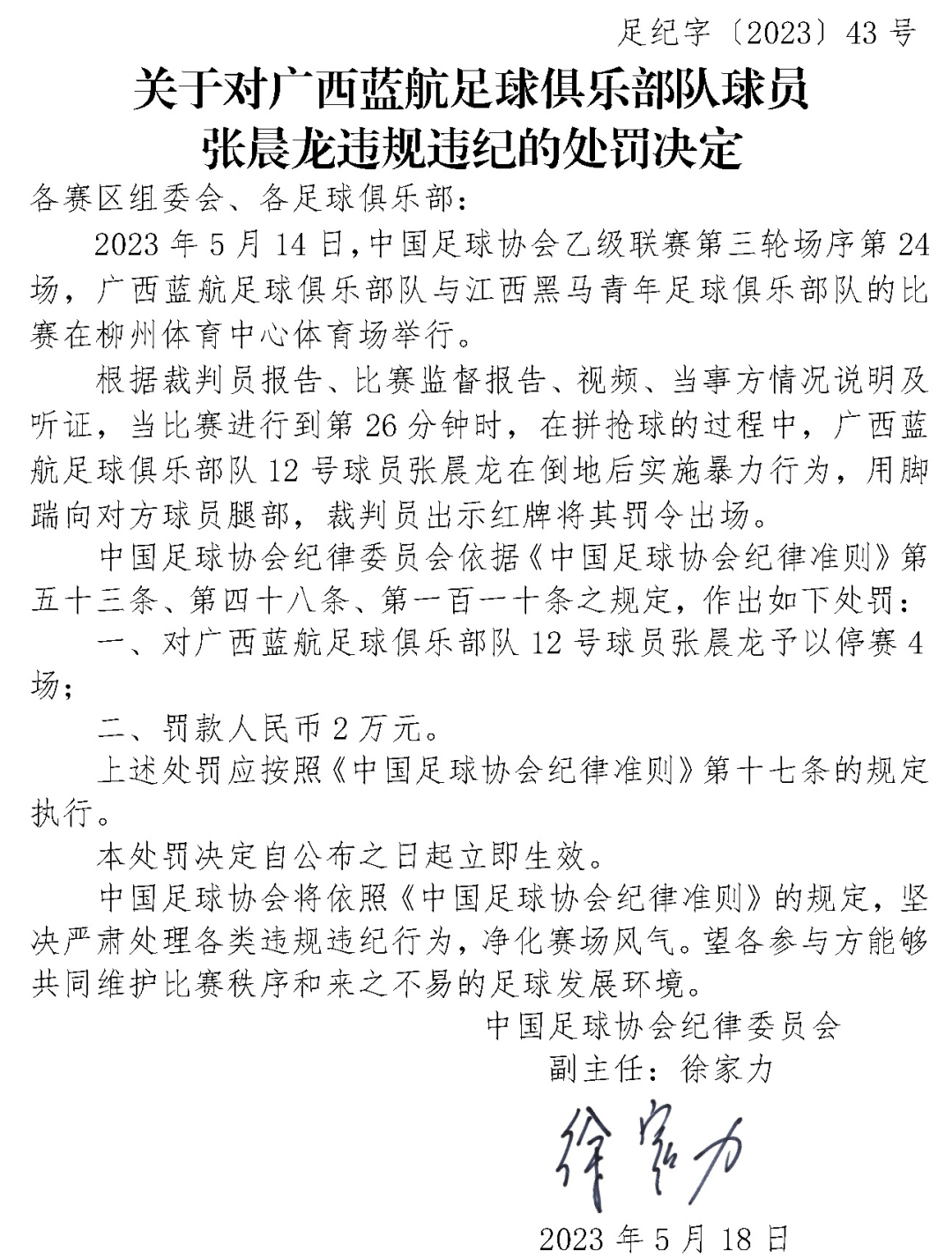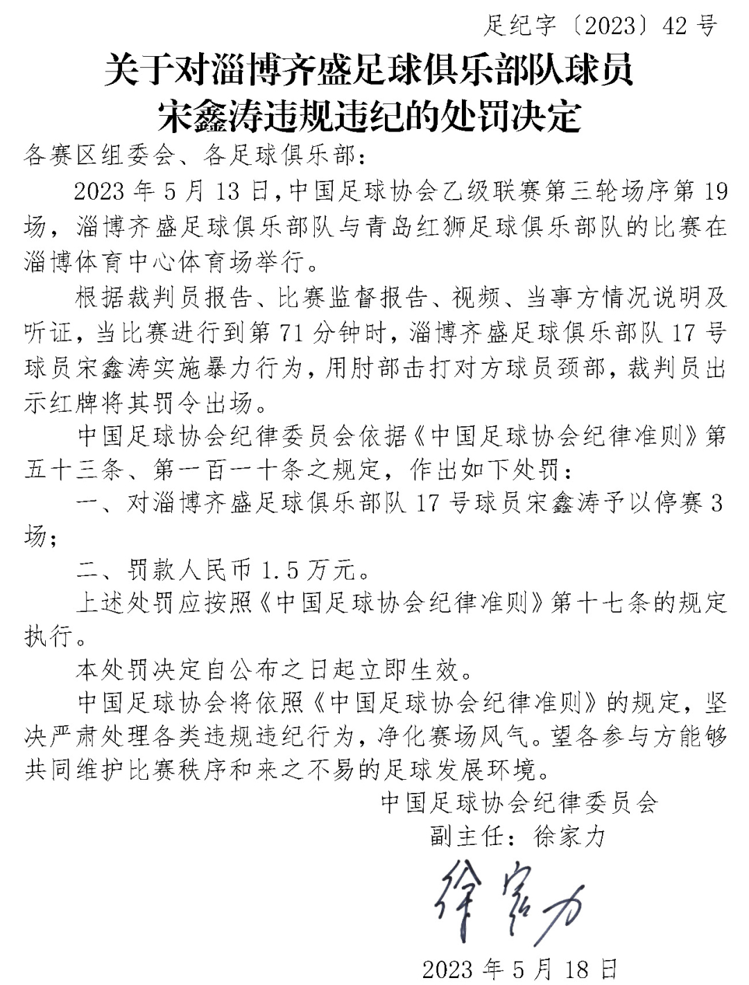 足协连开3张罚单! 2023-05-18 16:58 中国新闻网 0 5月18日,中国足协官网连发三份处罚决定,对淄博齐盛足球俱乐部队球员宋鑫涛、广西蓝航足球俱乐部队球员张晨龙和黑龙江冰城足球俱乐部队进行停赛或罚款处罚。详细内容如下: