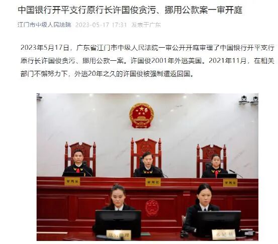 2023年5月17日,广东省江门市中级人民法院一审公开开庭审理了中国银行开平支行原行长许国俊贪污、挪用公款一案。许国俊2001年外逃美国。2021年11月,在相关部门不懈努力下,外逃20年之久的许国俊被强制遣返回国。