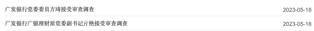 另外,据中央纪委国家监委驻中国人寿纪检监察组、辽宁省纪委监委消息:广发银行广银理财有限责任公司原党委副书记、监事长、纪委书记亓艳涉嫌严重违纪违法,目前正接受中央纪委国家监委驻中国人寿纪检监察组纪律审查和辽宁省抚顺市清原县监委监察调查。