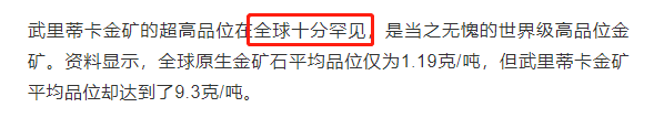 而紫金矿业曾在公众号上介绍,武里蒂卡金矿的超高品位在全球十分罕见,是当之无愧的世界级高品位金矿。资料显示,全球原生金矿石平均品位仅为1.19克/吨,但武里蒂卡金矿平均品位却达到了9.3克/吨。