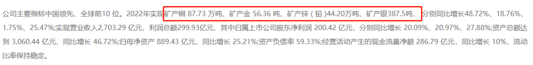 公司主要指标国内领先、全球前10位。2022年实现矿产铜87.73万吨、矿产金56.36吨、矿产锌(铅)44.20万吨、矿产银387.5吨,分别同比增长48.72%、18.76%、1.75%、25.47%;实现营业收入2703.29亿元,归属上市公司股东净利润200.42亿元,分别同比增长20.09%、27.88%。
