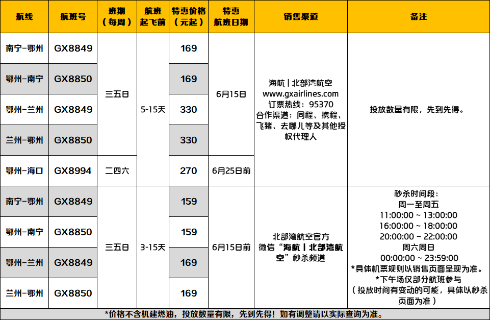 海航集团旗下北部湾航空推出一系列特价机票最低159元起(不含机建燃油)