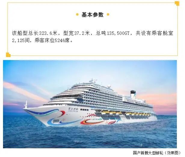 作为国产首制大型邮轮的主体设计建造单位,上海外高桥造船有限公司通过其官方微信号发布的信息显示,我国首艘国产大型邮轮船型总长323.6米,型宽37.2米,总吨位13.55万吨,共设有乘客舱室2125间,乘客床位5246席。