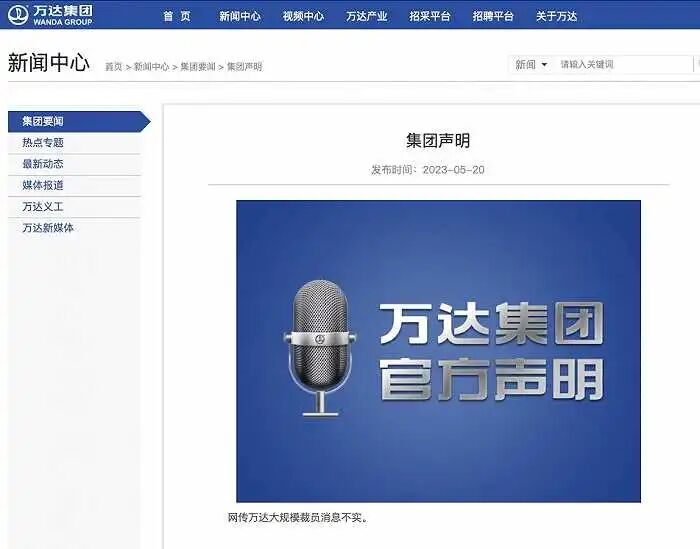 5月20日上午,万达集团在官网发布声明称,网传万达大规模裁员消息不实。
