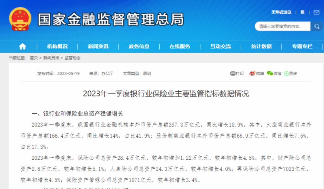 5月19日,国家金融监督管理总局发布2023年一季度银行业保险业主要监管指标数据。