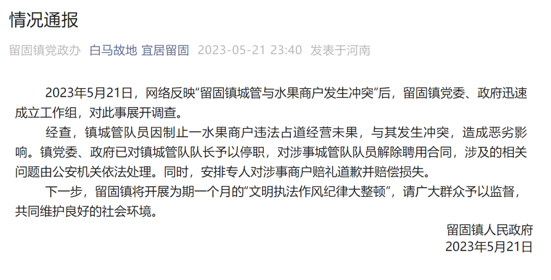 2023年5月21日,网络反映“留固镇城管与水果商户发生冲突”后,留固镇党委、政府迅速成立工作组,对此事展开调查。