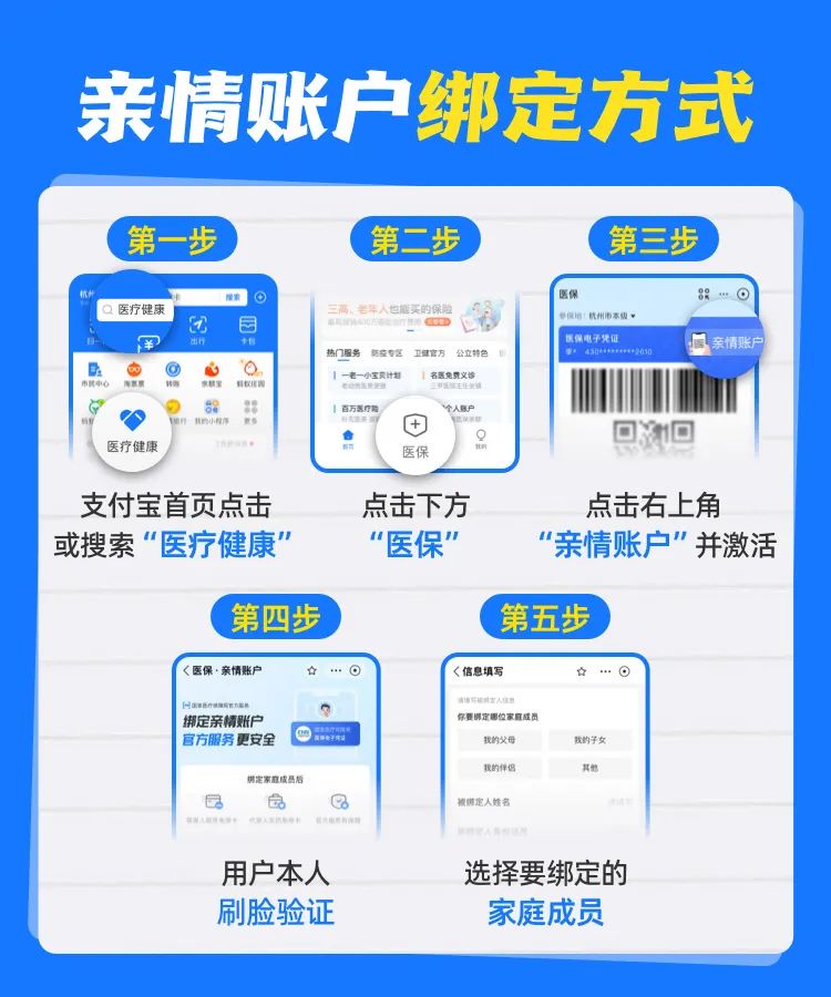 绑定方式也非常简单,用户只需在支付宝首页点击或搜索“医疗健康”,点击“医保”,即可在右上角找到“亲情账户”并为家人绑定。当被绑定家人为16周岁及以下的“小宝贝”时,需提供以下材料中的一项:
