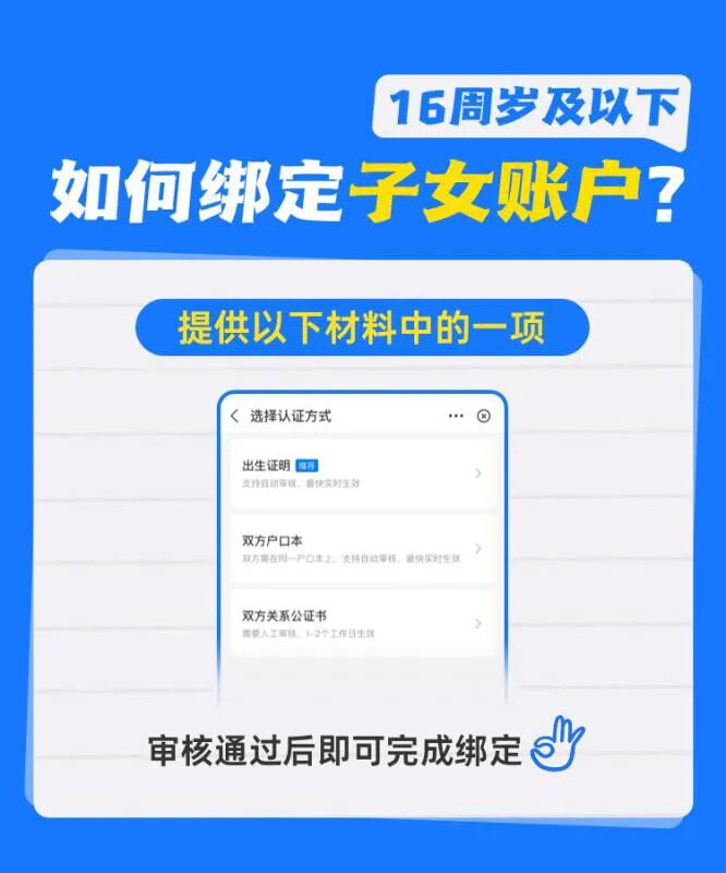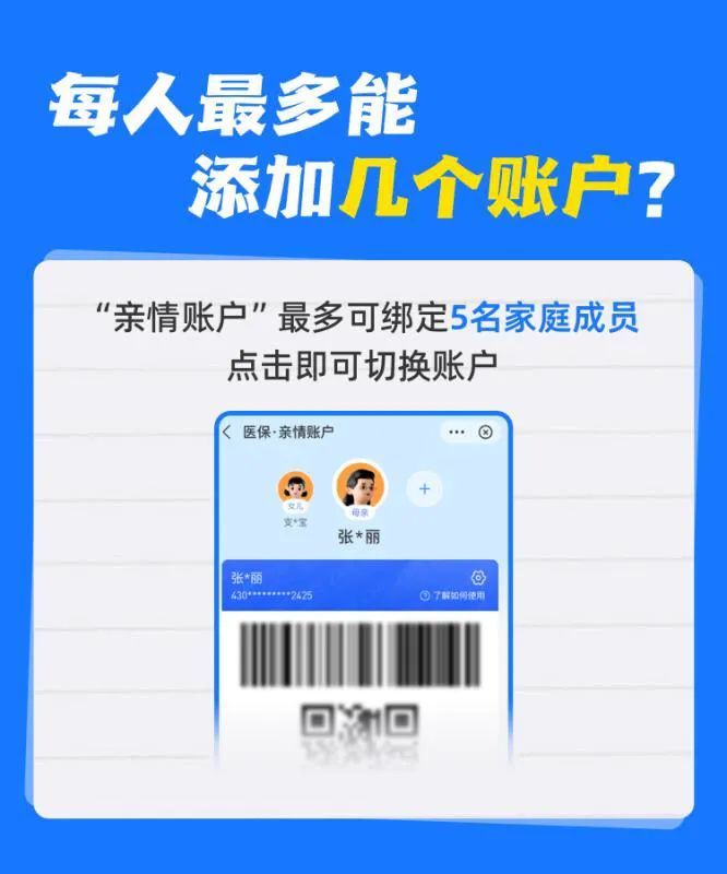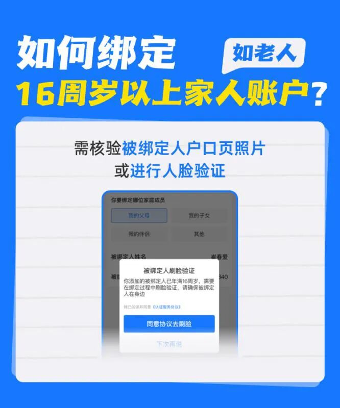 当被绑定家人为16周岁以上(如老人)时,需核验被绑定人户口页或进行人脸认证。“亲情账户”最多可绑定5名家庭成员。