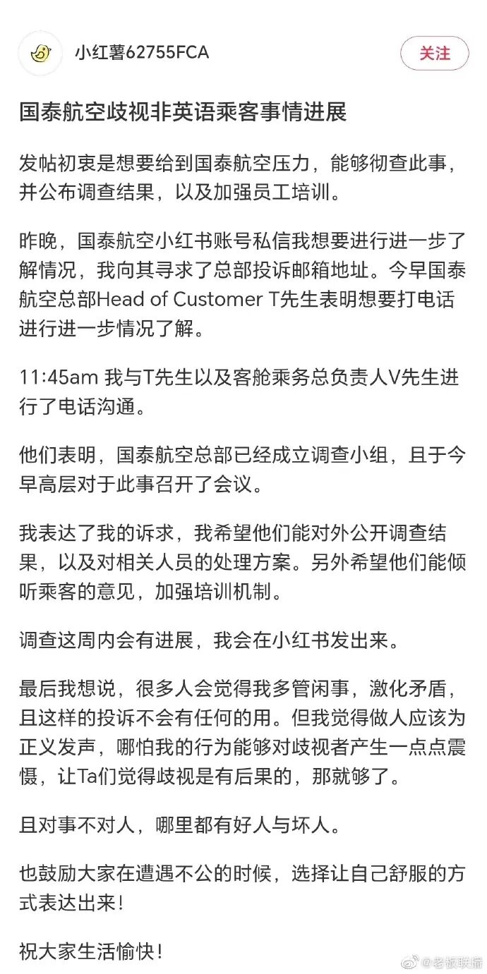 5月23日,国泰航空歧视非英语乘客事件爆料人,在社交媒体发文披露了进展。其表示,发帖初衷是想要给到国泰航空压力,能够彻查此事,并公布调查结果,以及加强员工培训。