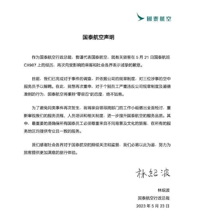 作为国泰航空行政总裁,林绍波代表国泰航空,就有关旅客在5月21日国泰航班CX987上的经历,再次向受影响的乘客和社会各界表示诚挚的歉意: