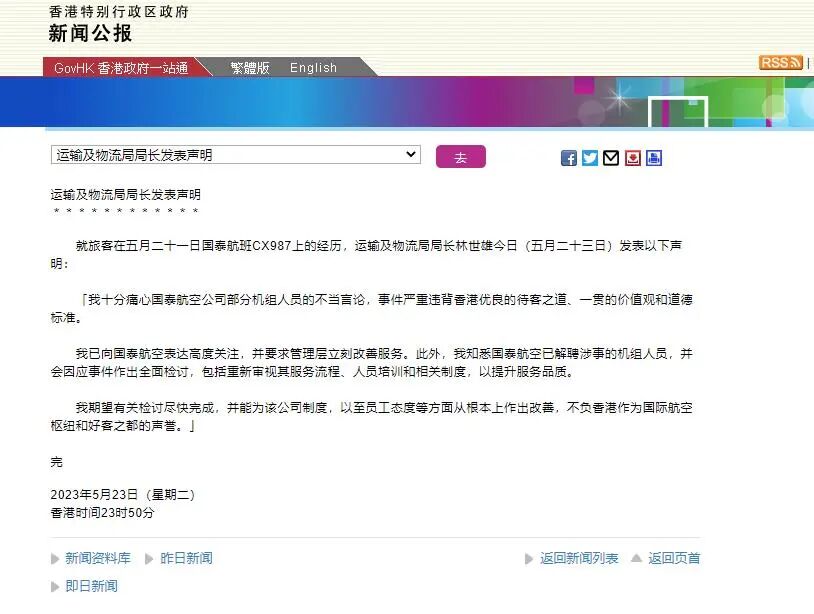 另据香港特区政府新闻公报消息,就旅客在5月21日国泰航班CX987上的经历,香港运输及物流局局长林世雄5月23日发表声明。