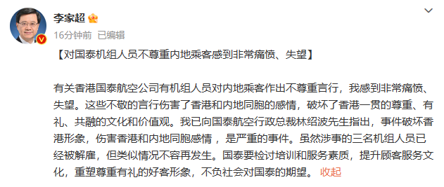 对此,李家超在微博发文:对国泰机组人员不尊重内地乘客感到非常痛愤、失望。