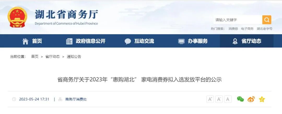 5月24日,省商务厅发布《关于2023年“惠购湖北” 家电消费券拟入选发放平台的公示》。