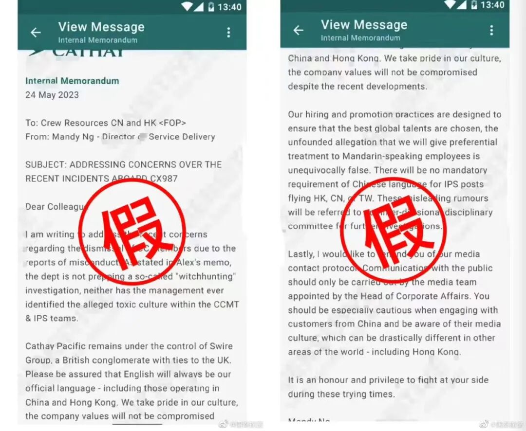 25日13点47分,@国泰航空 发布声明:我们留意到网络上流传有关国泰航空航空服务董事发出的一则英文内部信件,相关信息为伪造,并不属实。我们不希望这些虚假信息混淆视听,并保留一切追究法律责任的权利。