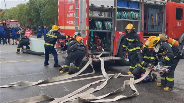 一声令下,一人三盘水带连接操比拼开始。两名消防员在连接分水器后,需要在跑动中迅速连接三条水带,并以最快速度冲向终点。除了这个项目,参赛队员还在3000米跑和水罐消防车出两支水枪操上一较高下。他们挥汗如雨、奋勇争先。