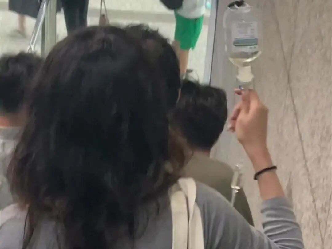 视频显示,在下行的电动扶梯上,女子左手插着针管,右手将输液瓶举过头顶。