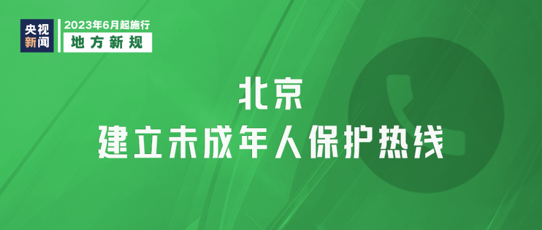 新修订的《北京市未成年人保护条例》将于6月1日起实施。《条例》规定,北京市依托12345市民服务热线建立未成年人保护热线,设置专席人员,负责受理、转介涉及未成年人合法权益的诉求,收集意见建议,提供未成年人保护方面的咨询、帮助。