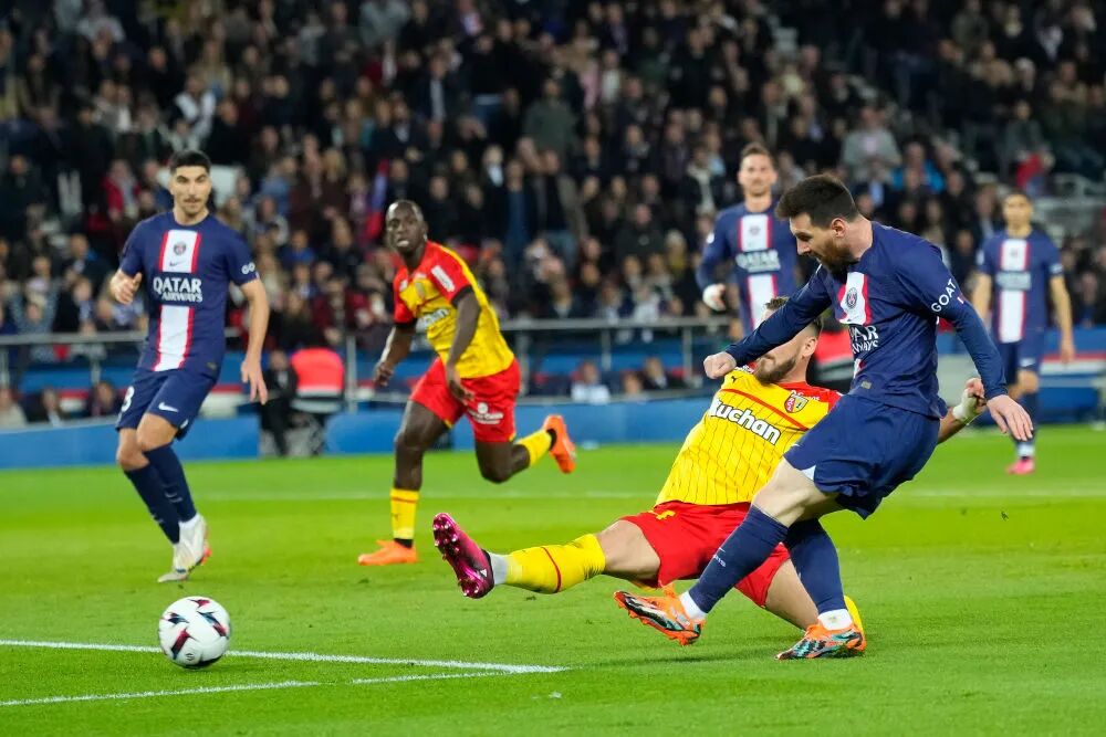 4月15日,巴黎圣日耳曼队球员梅西(前右一)在比赛中射门得分。新华社发(戈兰·热尔沃 摄)