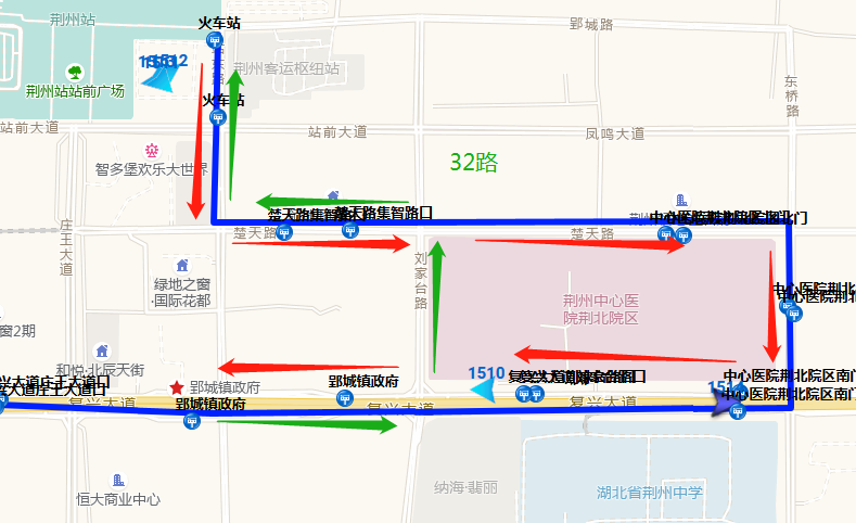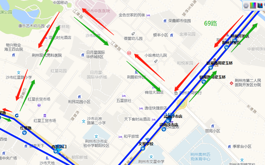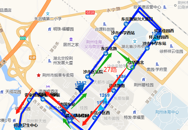 往沙市农场方向:工农路—荆沙大道—塔桥北路—长港路—江汉北路—北京路—燎原路—江津路—东方大道—渔龙路—北京东路