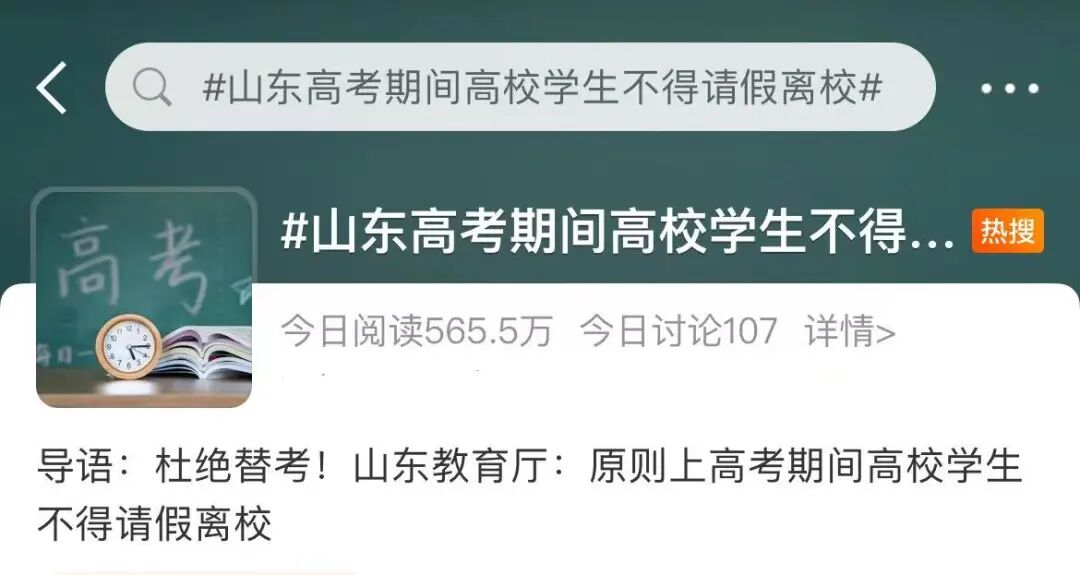 近日,多所高校官网通知,2023年高考期间高校学生不得请假离校,坚决杜绝学生违规参加高考或替考。相关话题冲上热搜。