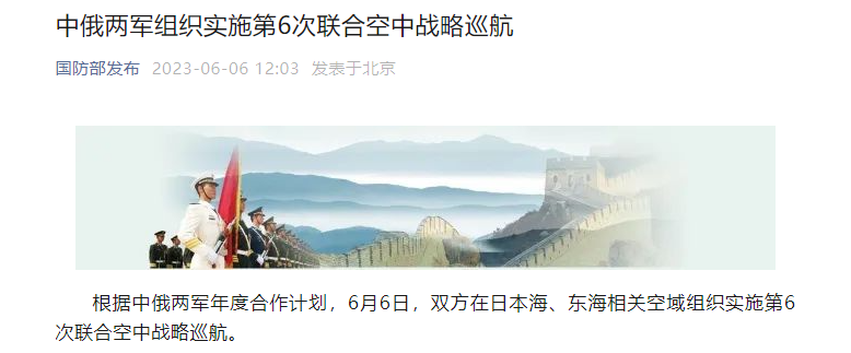 根据中俄两军年度合作计划,6月6日,双方在日本海、东海相关空域组织实施第6次联合空中战略巡航。