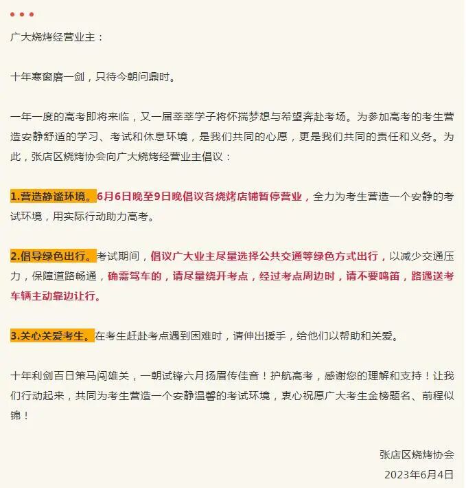 倡议书提出,一年一度的高考即将来临,为参加高考的考生营造安静舒适的学习、考试和休息环境,张店区烧烤协会向广大烧烤经营业主倡议,6月6日晚至9日晚暂停营业,全力为考生营造一个安静的考试环境,用实际行动助力高考。