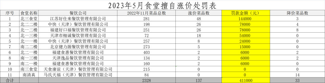 1. 对擅自涨价菜品的当事食堂按照每涨价一个菜品罚款3000元的额度进行罚款处理,要求立刻下调价格并在食堂价目表显示。对降价菜品较多的南校区清真食堂奖励2000元。所罚款项纳入餐饮管理中心奖罚基金,专款专用,用于改善学生膳食工作。