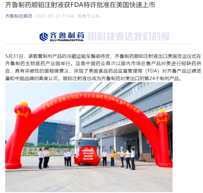 该文章还显示,5月31日,齐鲁制药顺铂注射液出口美国发运仪式在齐鲁制药生物医药产业园举行。这是中国药企首次以国内市场在售产品对美进行短缺药供应。