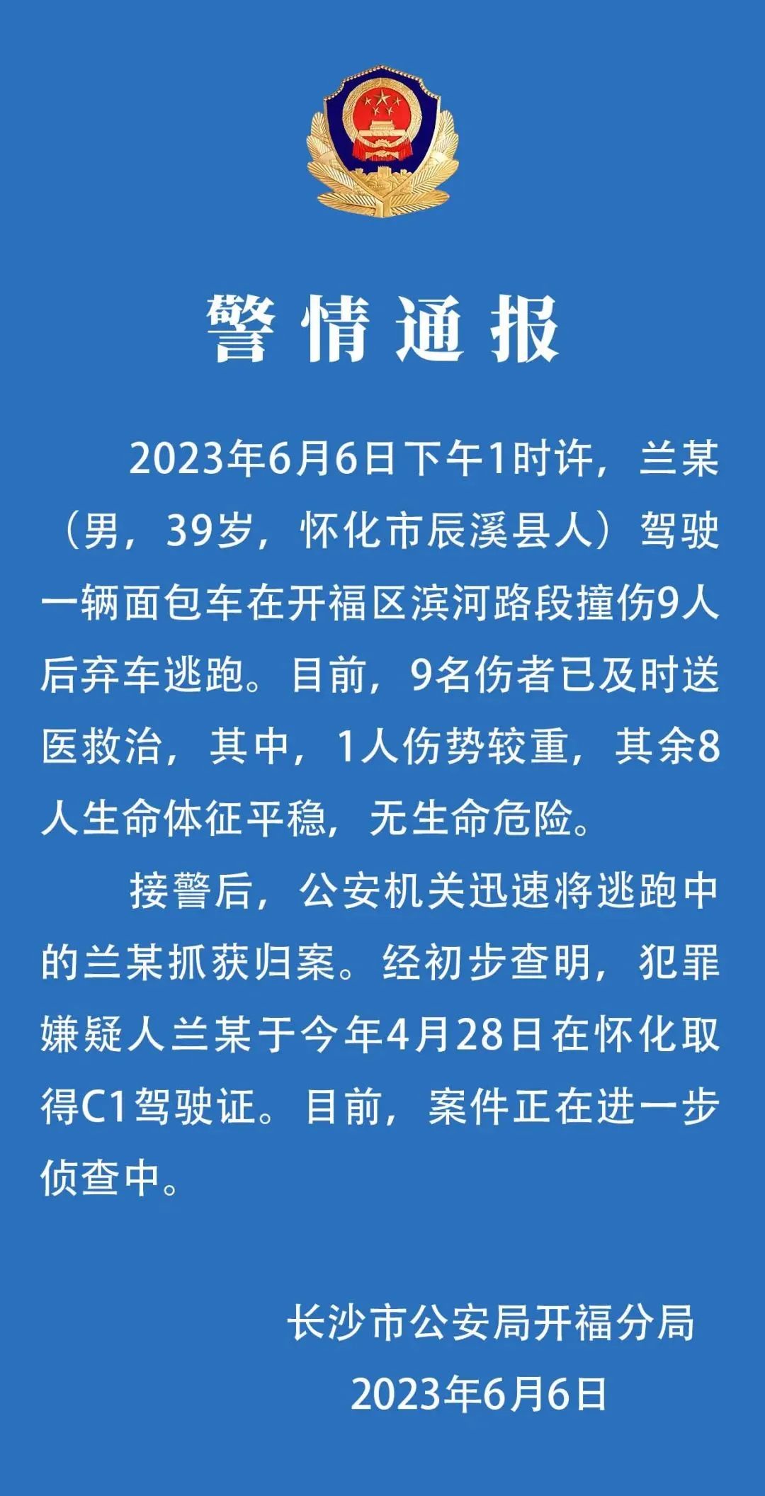 6日,长沙开福警方就“男子驾车撞伤9人后弃车逃跑”一事发布警情通报,全文如下: