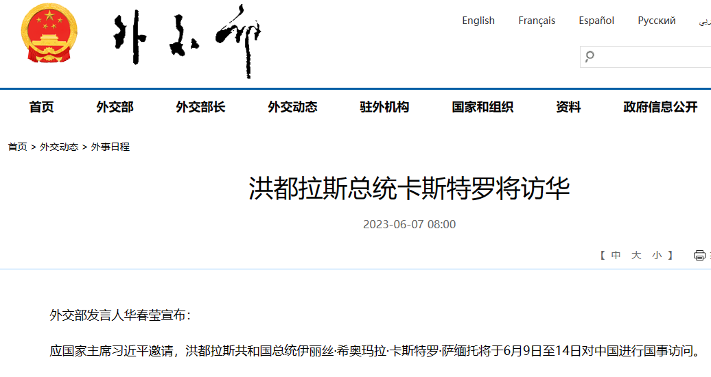 应国家主席习近平邀请,洪都拉斯共和国总统伊丽丝·希奥玛拉·卡斯特罗·萨缅托将于6月9日至14日对中国进行国事访问。