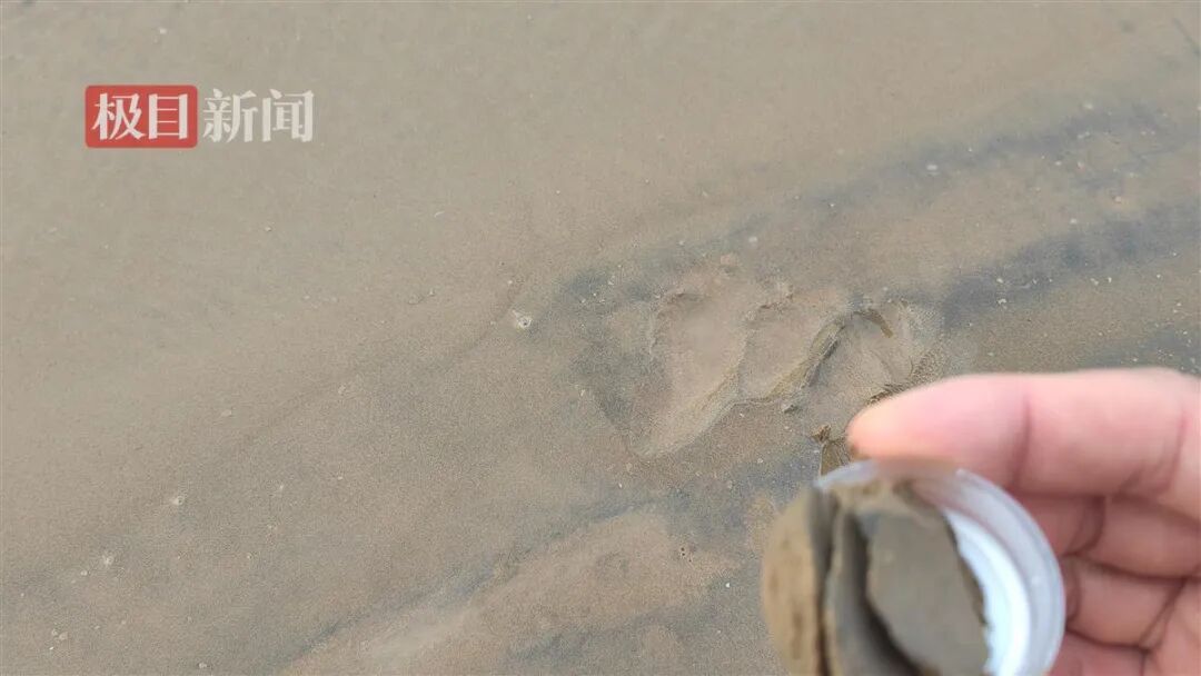 随后,记者在芦寨村、芦才村附近河段走访了数百米,未发现黑色水体,其中在回流岸边的一处长约几十米的位置有煤渣(块)沉淀在河边。近百米范围内,记者发现了5处被浸泡过的煤渣(块)散落在砂石中。在几百米的范围内,有大量黑色粉末状颗粒物覆盖在河床上,用手剥开可见下面黄色的泥沙。