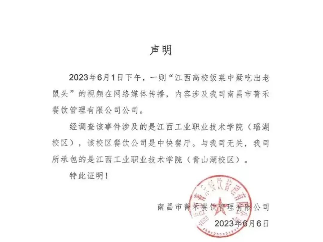 事情发生后,有不少网友把矛头指向南昌市菁禾餐饮管理有限公司。6月6日,该公司在其社交账号发布一则声明,称“江西高校饭菜中疑吃出老鼠头”的视频在网络媒体传播,经调查该事件涉及的是江西工业职业技术学院(瑶湖校区),该校区餐饮公司是中快餐厅,与南昌市菁禾餐饮管理有限公司无关。