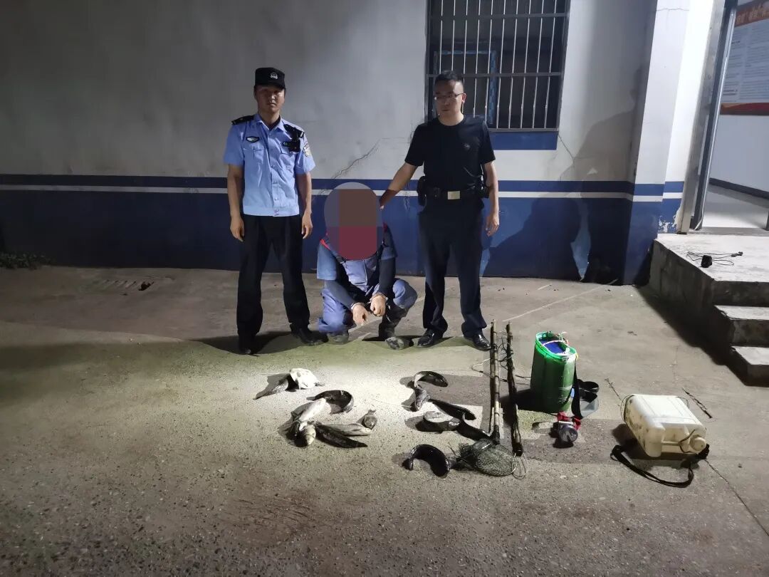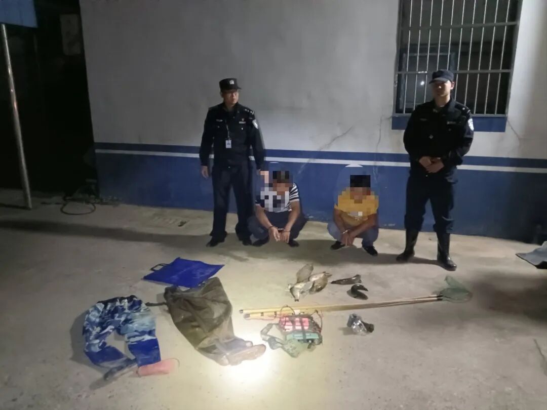 5月25日,民警获悉相关线索,在长江监利段西门渊闸口水域成功抓获通过电捕鱼实施非法捕捞水产品的嫌疑人2名,现场查获电瓶、逆变器、电击杆以及渔获物4千克。