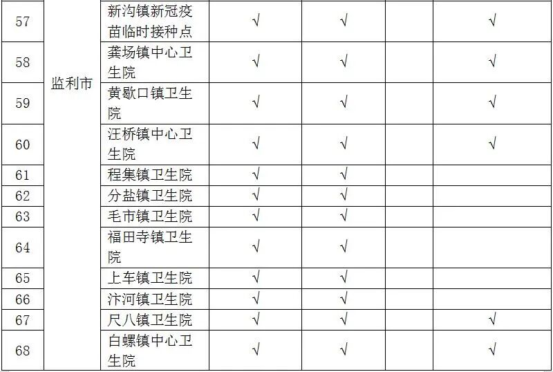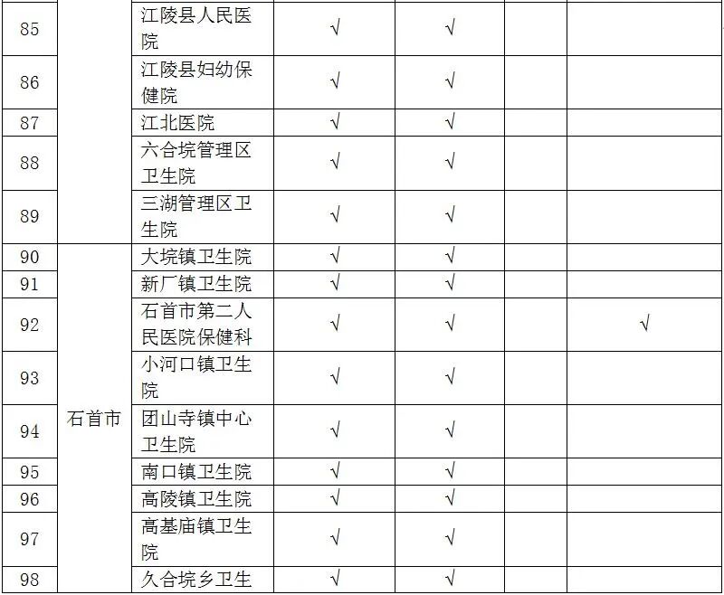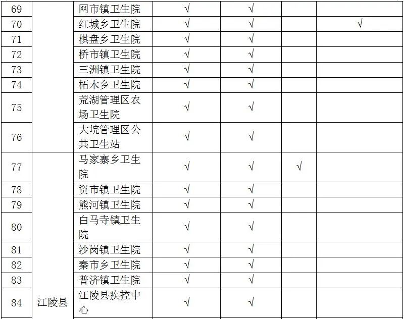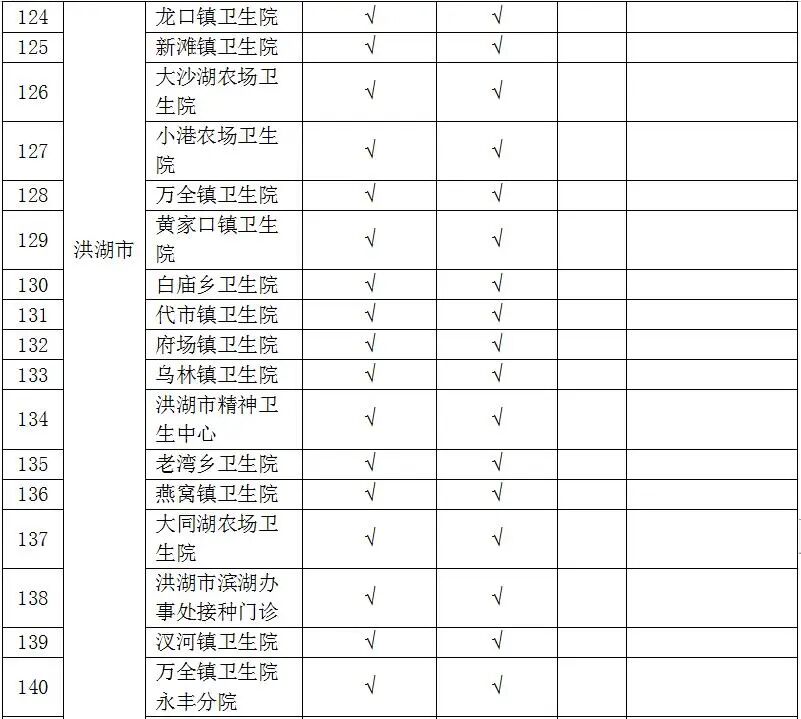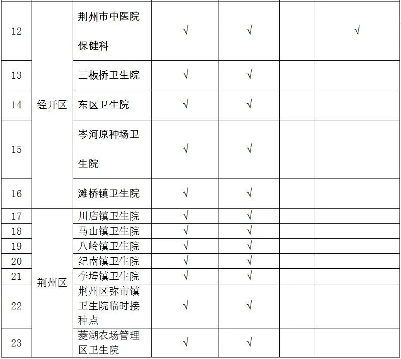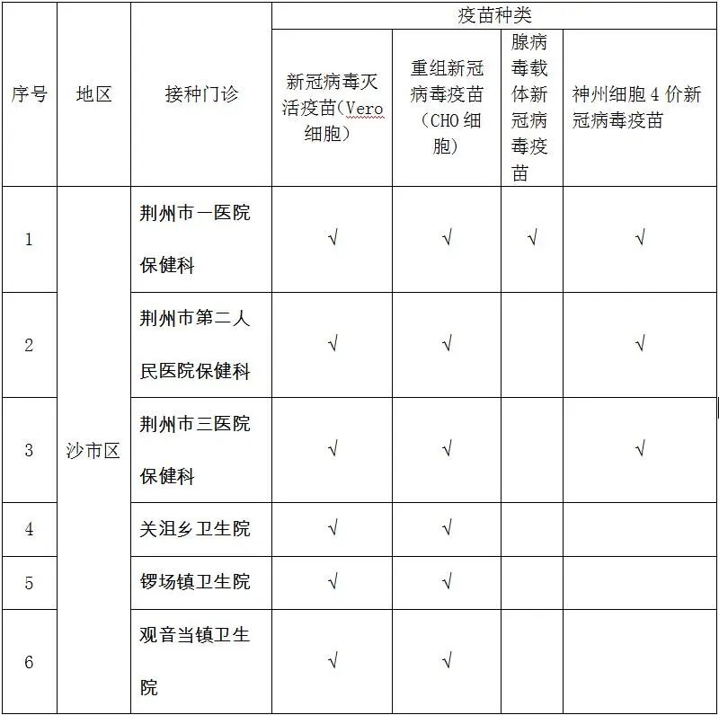 目前,荆州市供应的新冠病毒疫苗种类有灭活疫苗(Vero细胞)、重组蛋白疫苗(CHO细胞)、腺病毒载体疫苗、神州细胞4价新冠病毒疫苗。具体接种门诊及供应疫苗种类见下表。
