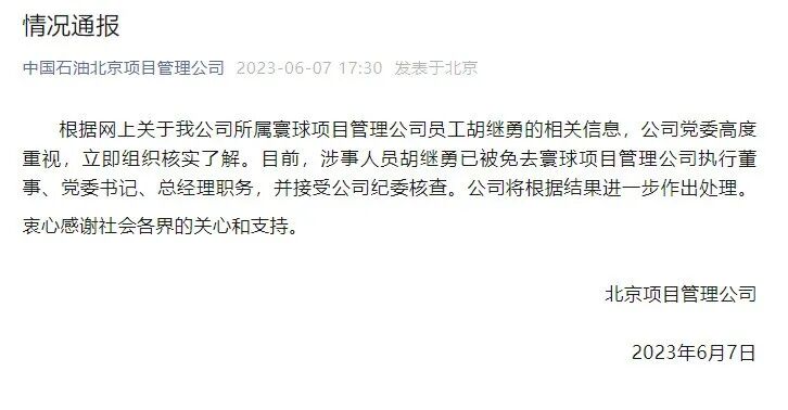 6月7日,中国石油北京项目管理公司微信公众号发布情况通报:根据网上关于我公司所属寰球项目管理公司员工胡继勇的相关信息,公司党委高度重视,立即组织核实了解。目前,涉事人员胡继勇已被免去寰球项目管理公司执行董事、党委书记、总经理职务,并接受公司纪委核查。公司将根据结果进一步作出处理。衷心感谢社会各界的关心和支持。